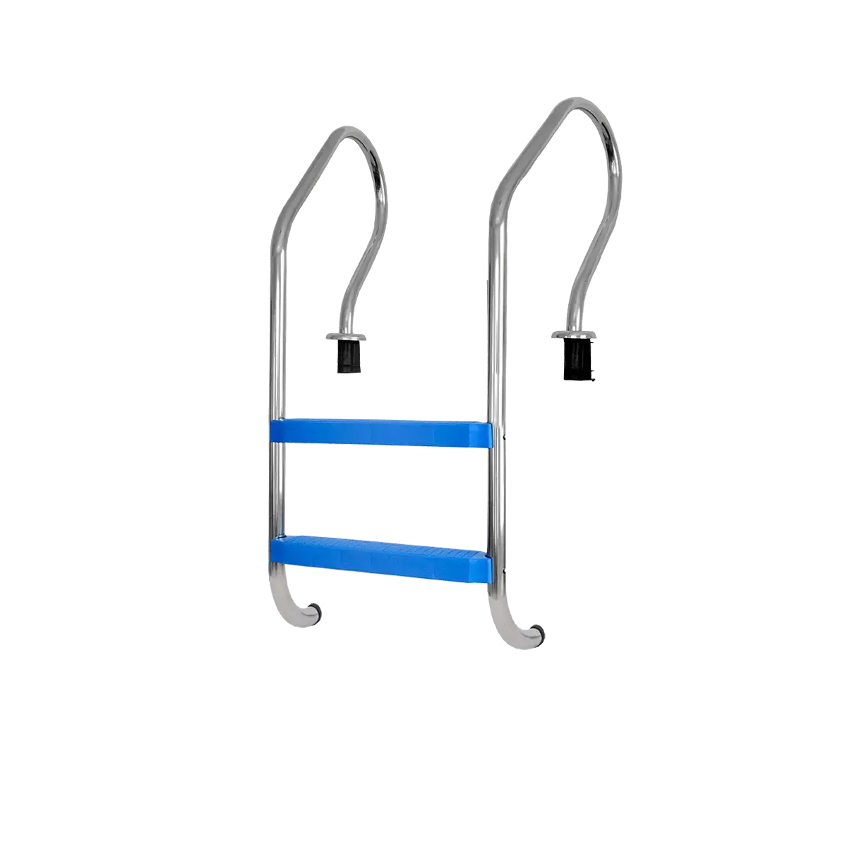 Escalera Vulcano 2 escalones. Posee laterales de acero inoxidable y peldaños plásticos. Incluye 2 anclajes y, según sus dimensiones, es ideal para ser colocada en profundidades que van desde 80 a 100 cm.
