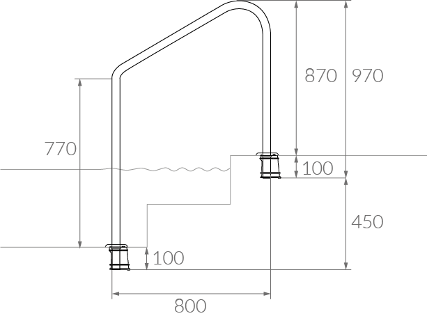 Pasamanos Vulcano corto para 2 escalones. Fabricado de acero inoxidable 304, tiene un diámetro ø38,1 mm y terminación pulida brillante. Sólo para piscinas de hormigón. Es un accesorio auxiliar que correctamente ubicado y fijado, permite realizar movimientos cómodos y seguros dentro de la piscina.